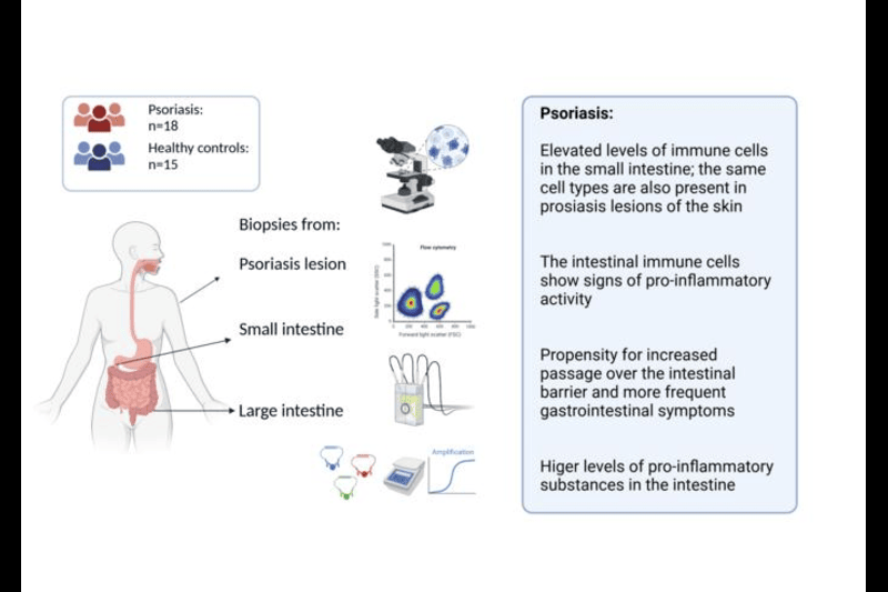 The study involved 18 patients with psoriasis and 15 healthy controls as subjects. None of the participants had been diagnosed with gastrointestinal diseases. Samples were taken from both their small and large bowel. The researchers then studied different types of immune cells in the mucous membrane.