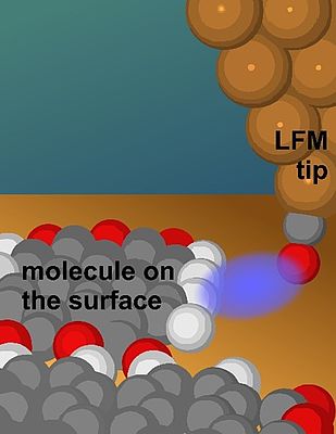 Artists rendition of a LFM tip coming close to the side of a molecule, where it is sensitive to the terminal H-atoms. © A. J. Weymouth