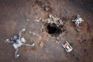 The three-week tests concluded with the final demonstration of the overall mission in front of external visitors, including representatives of the European Commission, the European Space Agency (ESA), the German Aerospace Center (DLR), the Spanish Centro para el Desarrollo Tecnológico Industrial (CDTI) and the French Centre national d’études spatiales (CNES). The first mission phase went smoothly, with the robotic team approaching the cave entrance while scanning and creating a map of the surrounding area. In the second stage, LUVMI-X carried the sensor cube through the skylight into the cave interior. To simulate the lunar drop velocities, an electric winch and cable were used to lower the cube. The data recorded in the process provided a precise 3D map of the cave entrance. The goal of the third mission phase was to reach the cave interior by lowering Coyote III. To do this, the rover docked via an interface to a cable and docking station provided by SherpaTT. A rope attached to it allowed it to slowly descend through the skylight and then land safely on the cave floor. Once down, the fourth and final phase of the mission began: Coyote III explored the unknown terrain and successfully created a map of the cave environment.